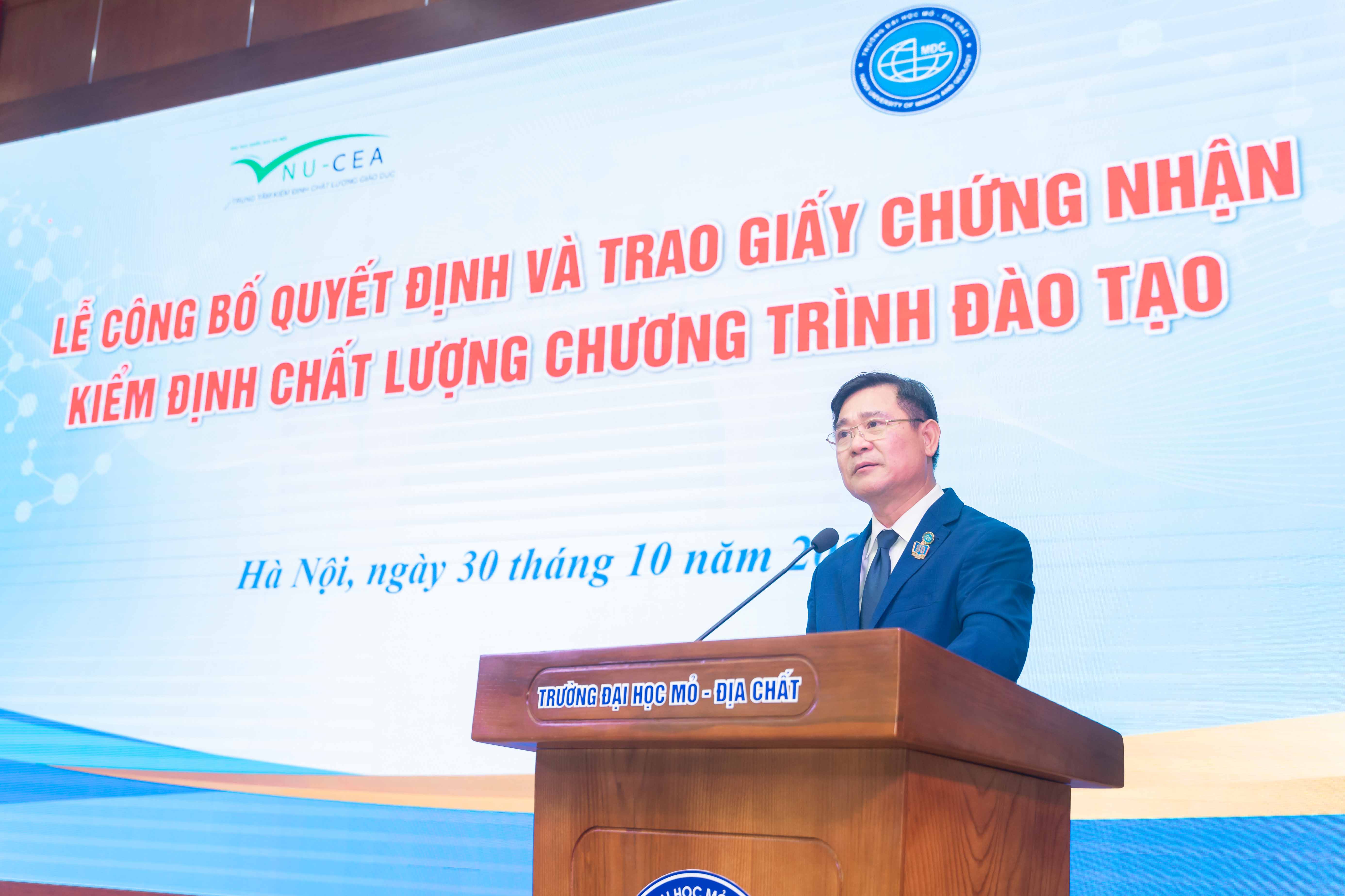 Phát biểu tại buổi lễ, PGS.TS Đinh Văn Toàn – Phó Giám đốc Trung tâm Kiểm định CLGD Đại học Quốc gia Hà Nội đã đánh giá cao tinh thần làm việc nghiêm túc, cầu thị của HUMG trong toàn bộ quá trình tự đánh giá và đánh giá ngoài. Trung tâm tự hào đồng hành cùng HUMG – ngôi trường kỹ thuật hàng đầu cả nước trong công cuộc đổi mới và phát triển. Đồng chí chia sẻ: