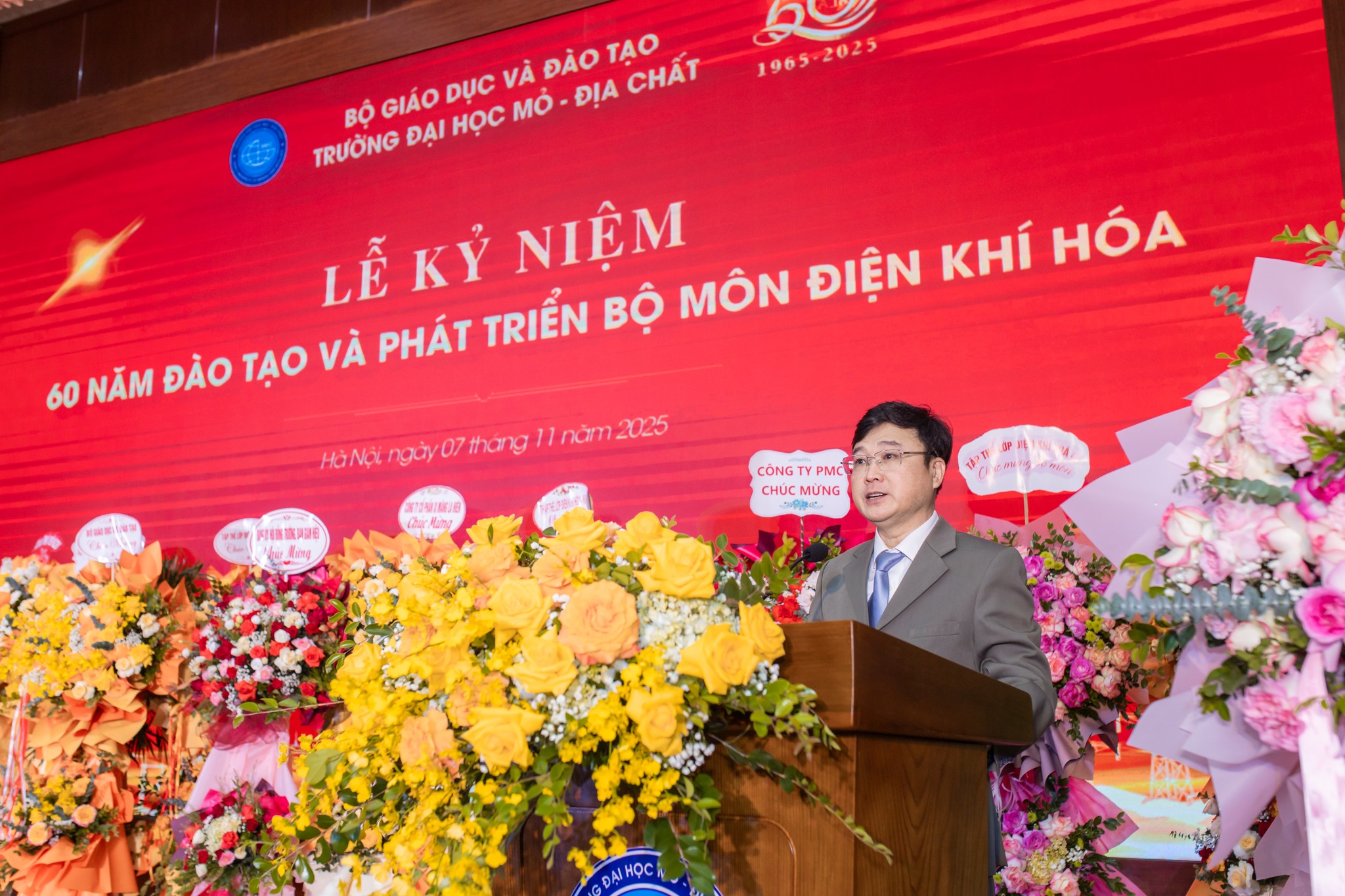 Phát biểu chúc mừng tại buổi lễ, PGS.TS Khổng Cao Phong – Trưởng khoa Cơ - Điện khẳng định vai trò tiên phong của Bộ môn Điện khí hóa trong công tác đào tạo, nghiên cứu khoa học và chuyển giao khoa học Công nghệ, Bộ môn Điện khí hóa khẳng định vị thế là một trong những đơn vị nòng cốt của khoa Cơ – Điện và của Trường Đại học Mỏ – Địa chất. Ông gửi gắm kỳ vọng Bộ môn tiếp tục đổi mới trong công tác đào tạo, nghiên cứu khoa học tập trung vào các lĩnh vực mũi nhọn như Công nghiệp mỏ, năng lượng tái tạo, lưới điện thông minh và trí tuệ nhân tạo.