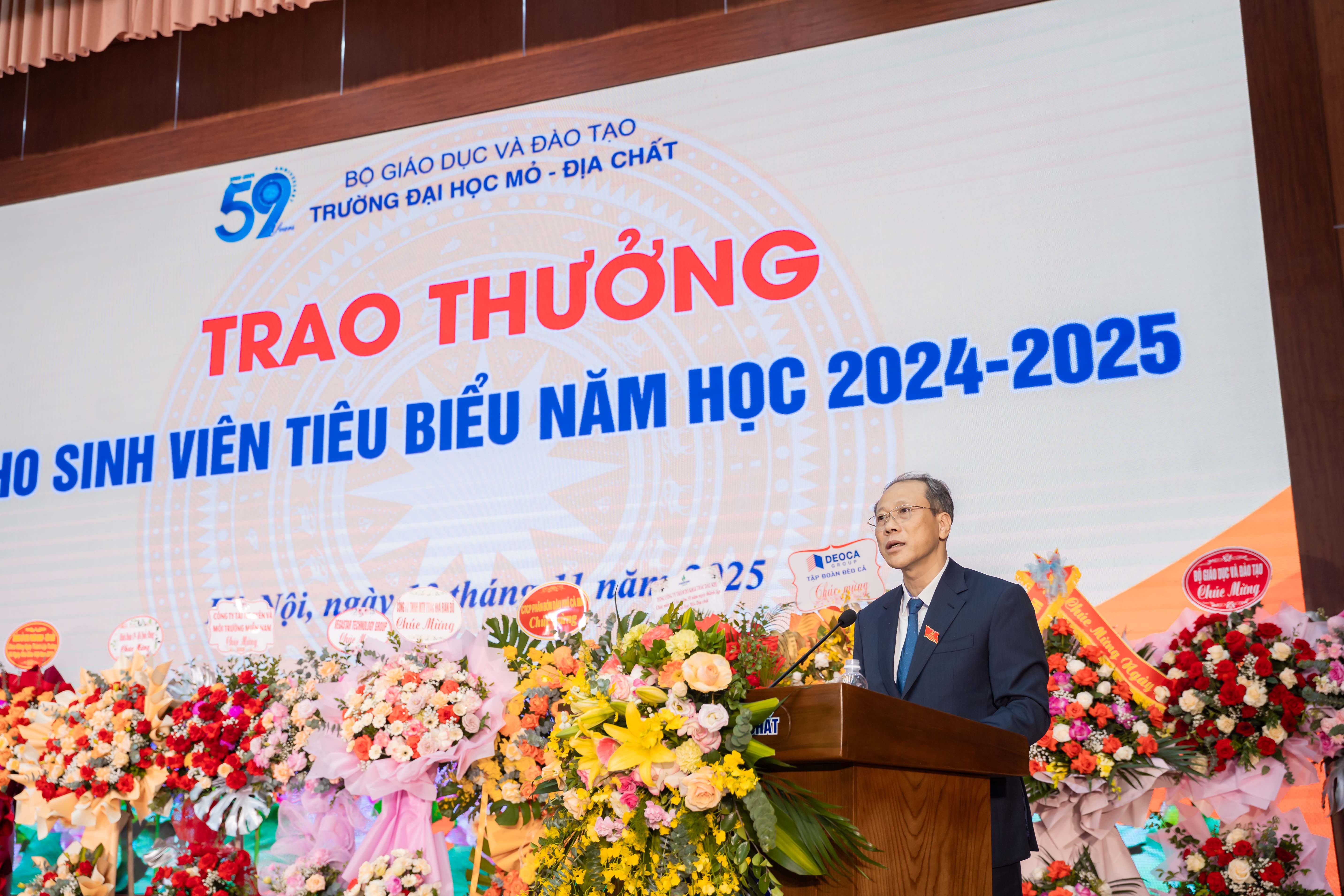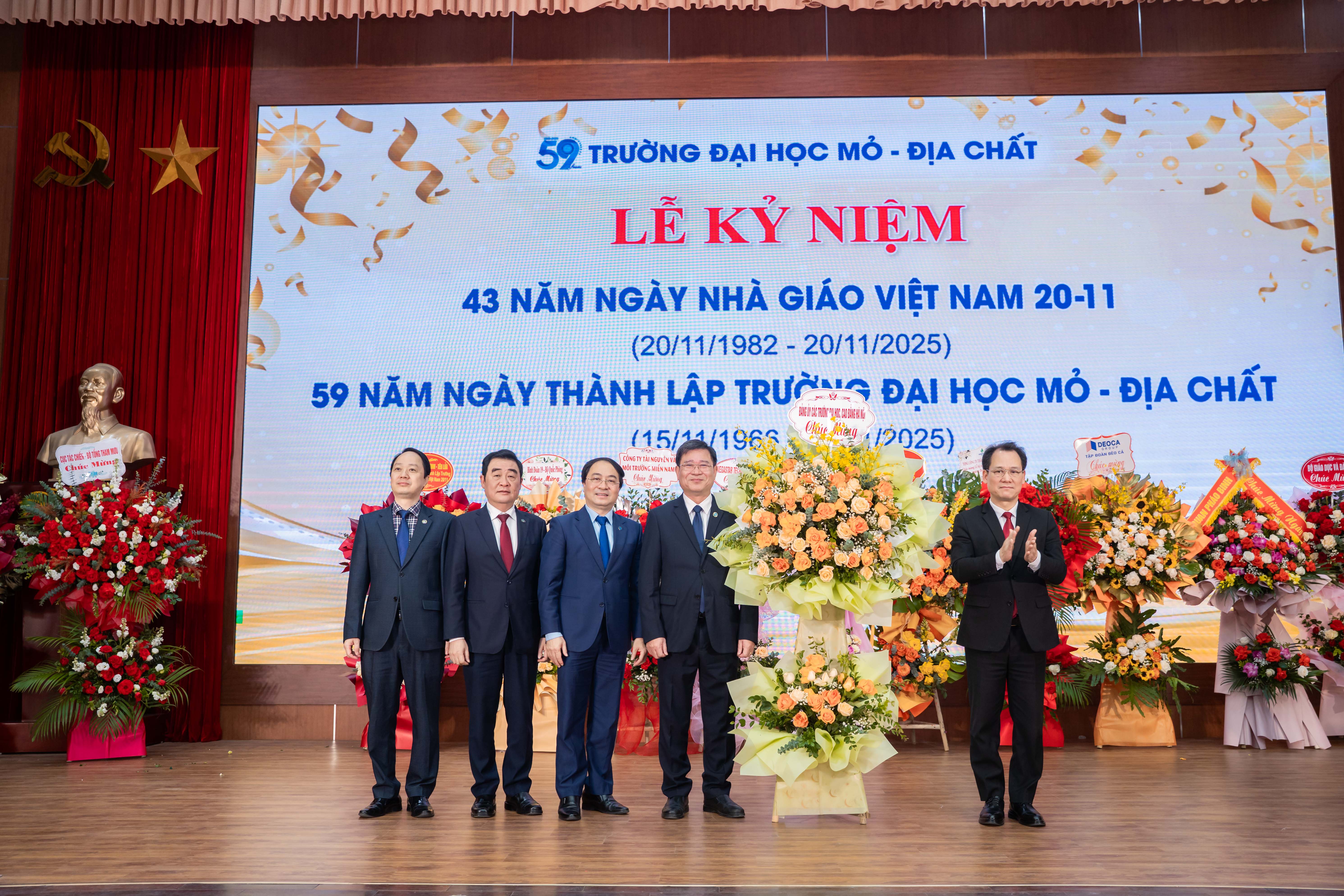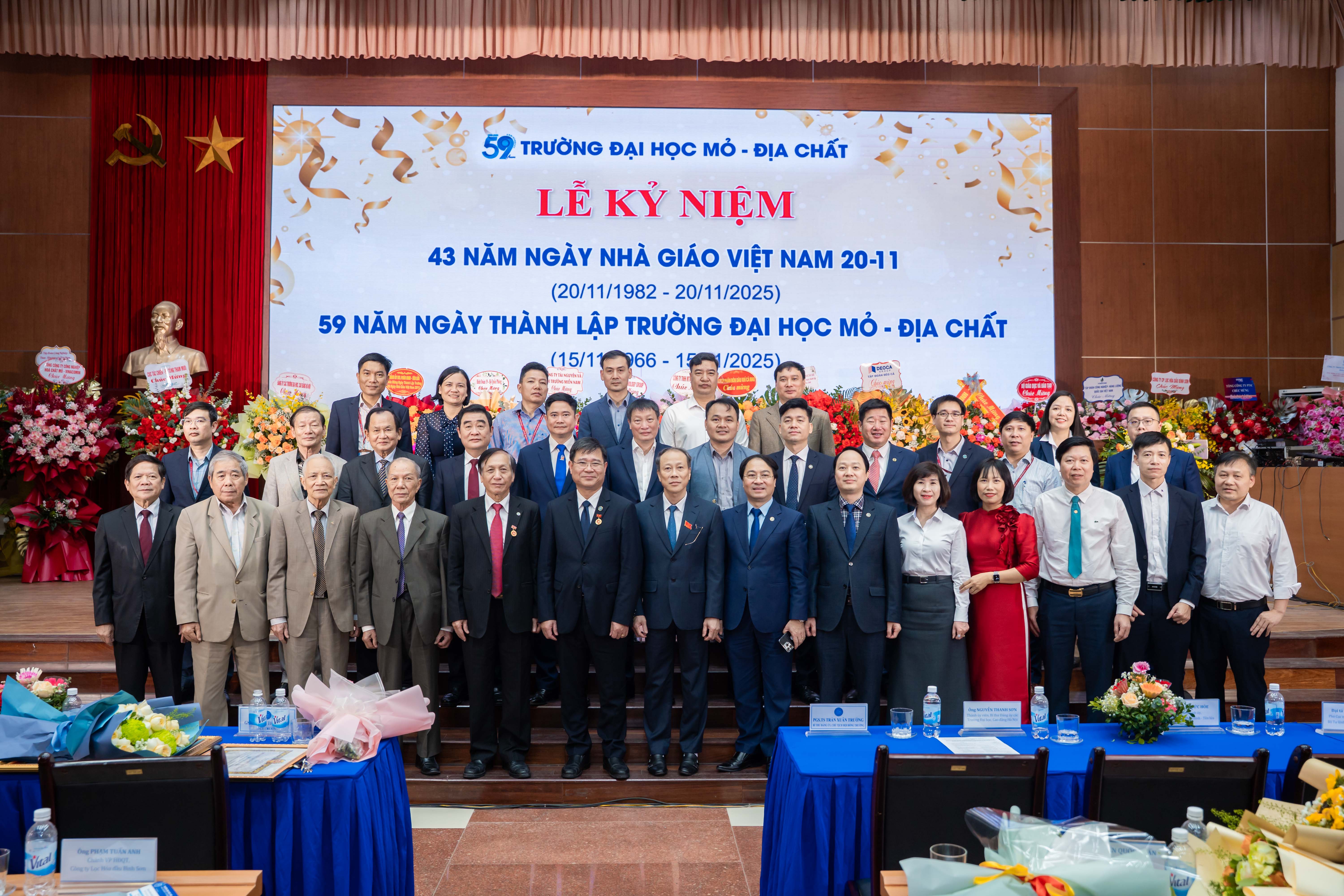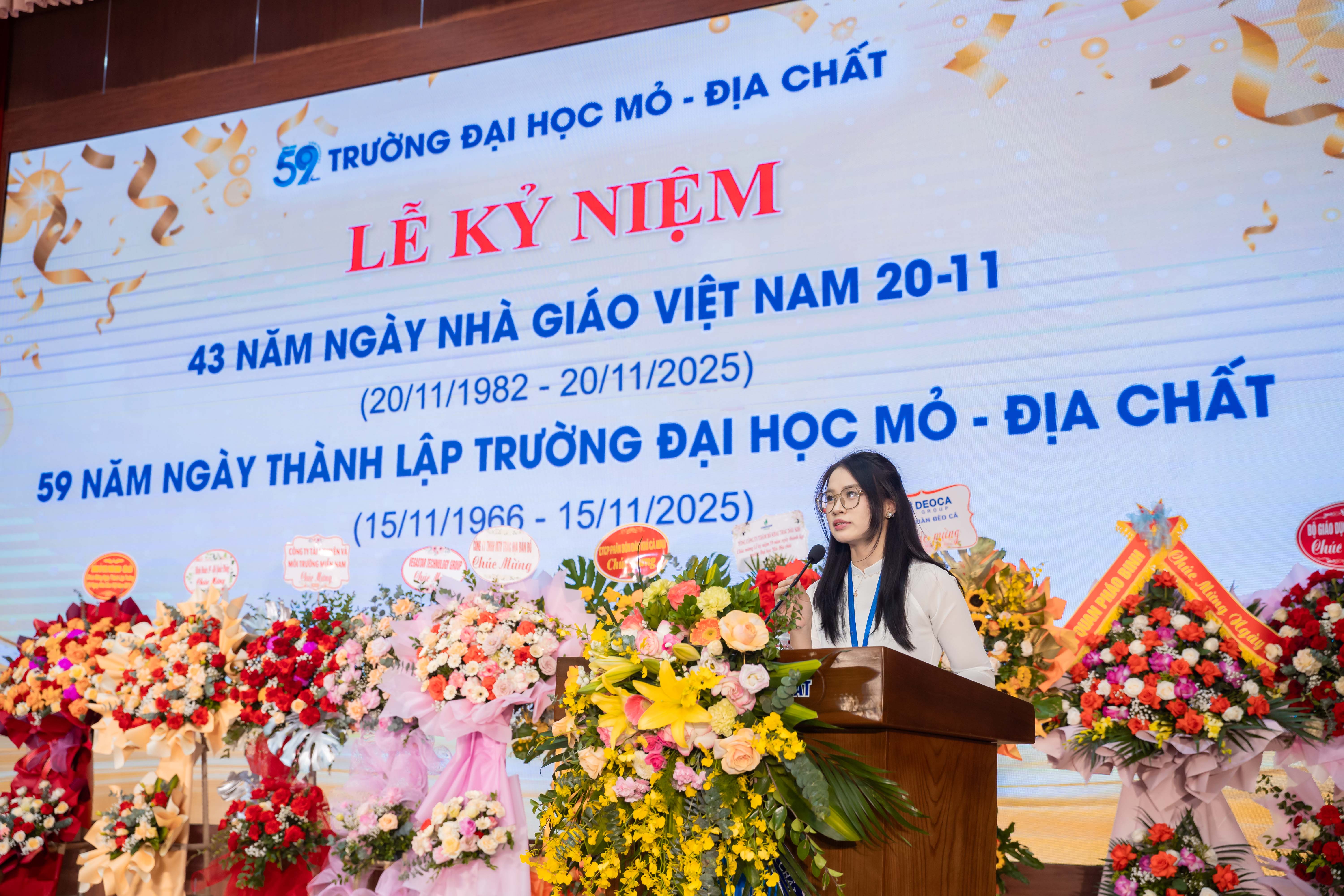 Tại buổi Lễ, các đại biểu đã nghe GS.TS Trần Thanh Hải – Hiệu trưởng HUMG đọc diễn văn kỷ niệm 59 năm ngày thành lập Trường và 43 năm Ngày Nhà giáo Việt Nam. Bài diễn văn đã ôn lại hành trình 59 năm đầy tự hào của HUMG: từ buổi khai giảng đầu tiên tại làng Bút Tháp trong hoàn cảnh chiến tranh gian khó, đến những năm tháng xây dựng cơ sở mới tại Phổ Yên (Thái Nguyên) và trở về Hà Nội. Các thế hệ thầy và trò HUMG đã kiên cường vượt qua mọi khó khăn để xây dựng nền tảng vững chắc cho sự phát triển hôm nay. Trải qua gần sáu thập kỷ, HUMG từng bước lớn mạnh, trở thành cơ sở đào tạo và nghiên cứu đa ngành uy tín hàng đầu trong các lĩnh vực khoa học trái đất, mỏ – địa chất, trắc địa – bản đồ, dầu khí, xây dựng, công nghệ thông tin, kinh tế và nhiều lĩnh vực khác.