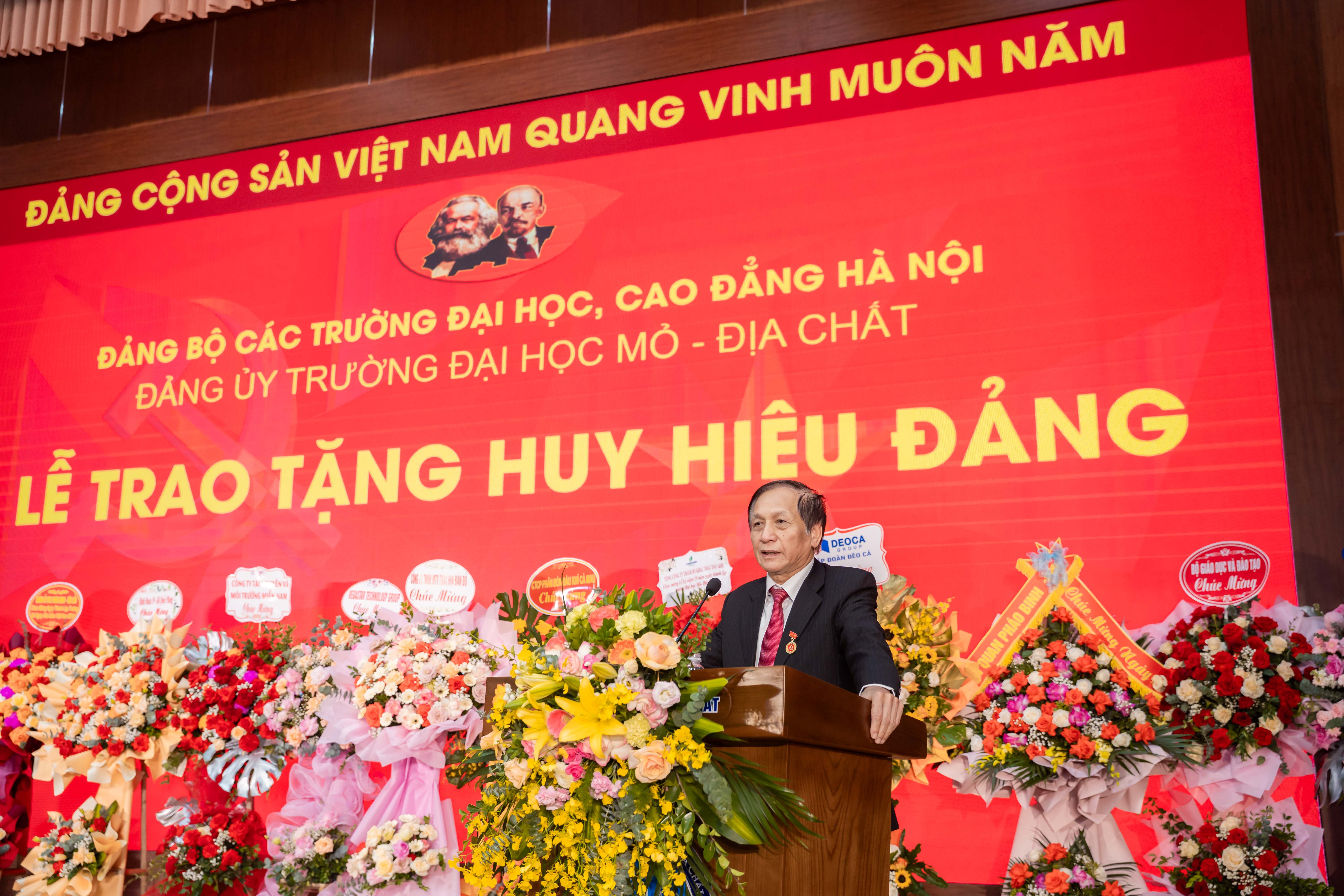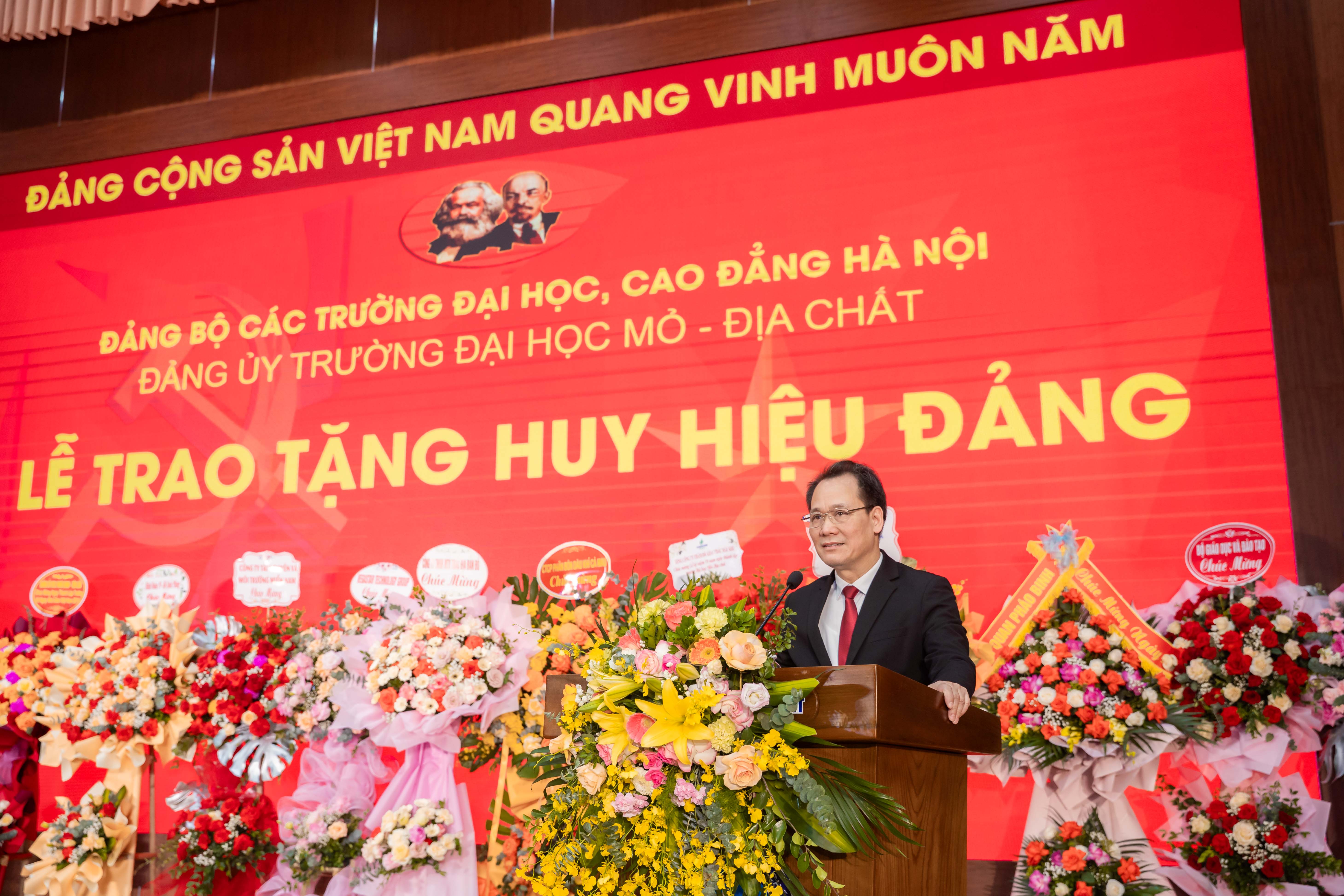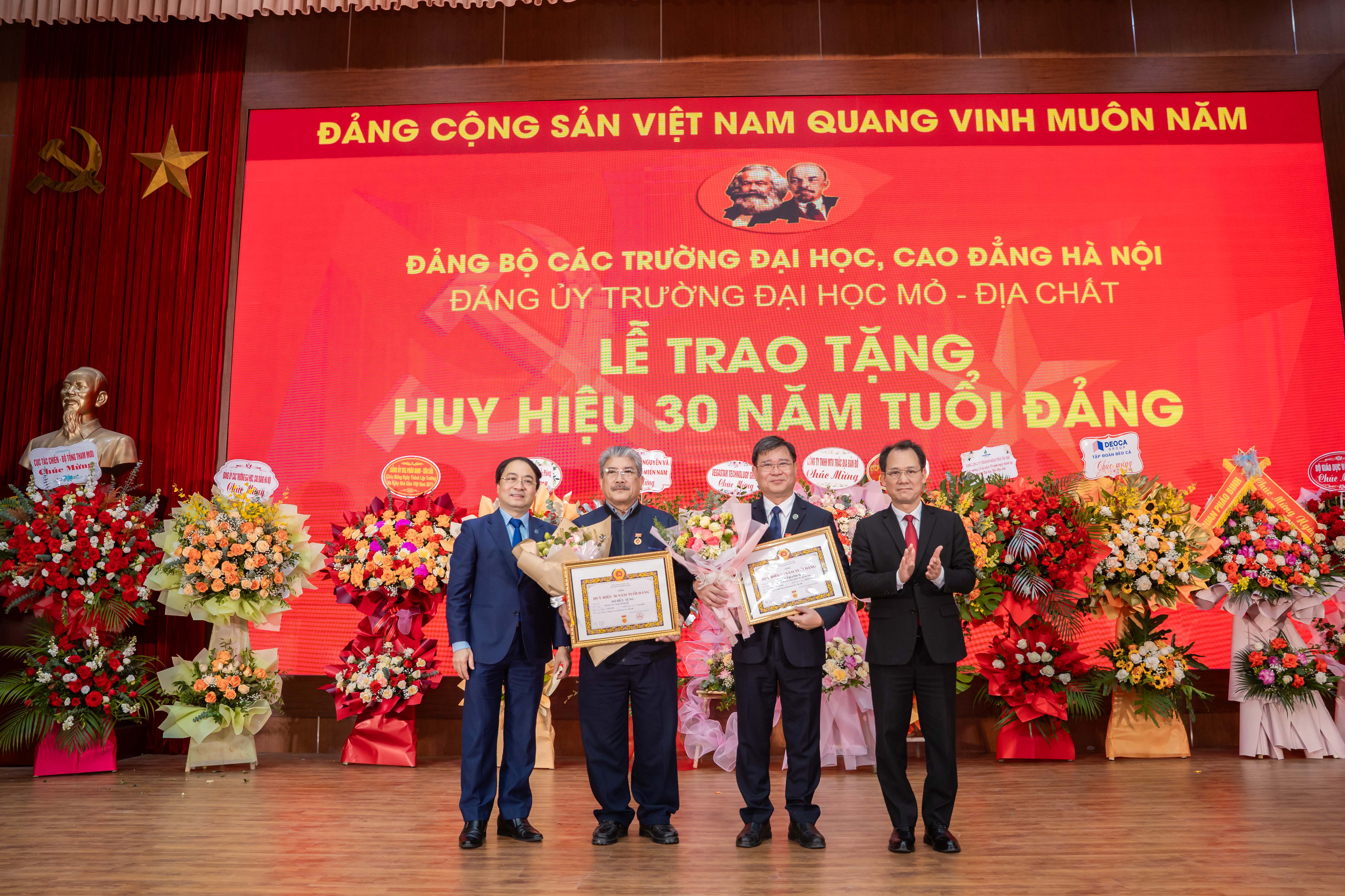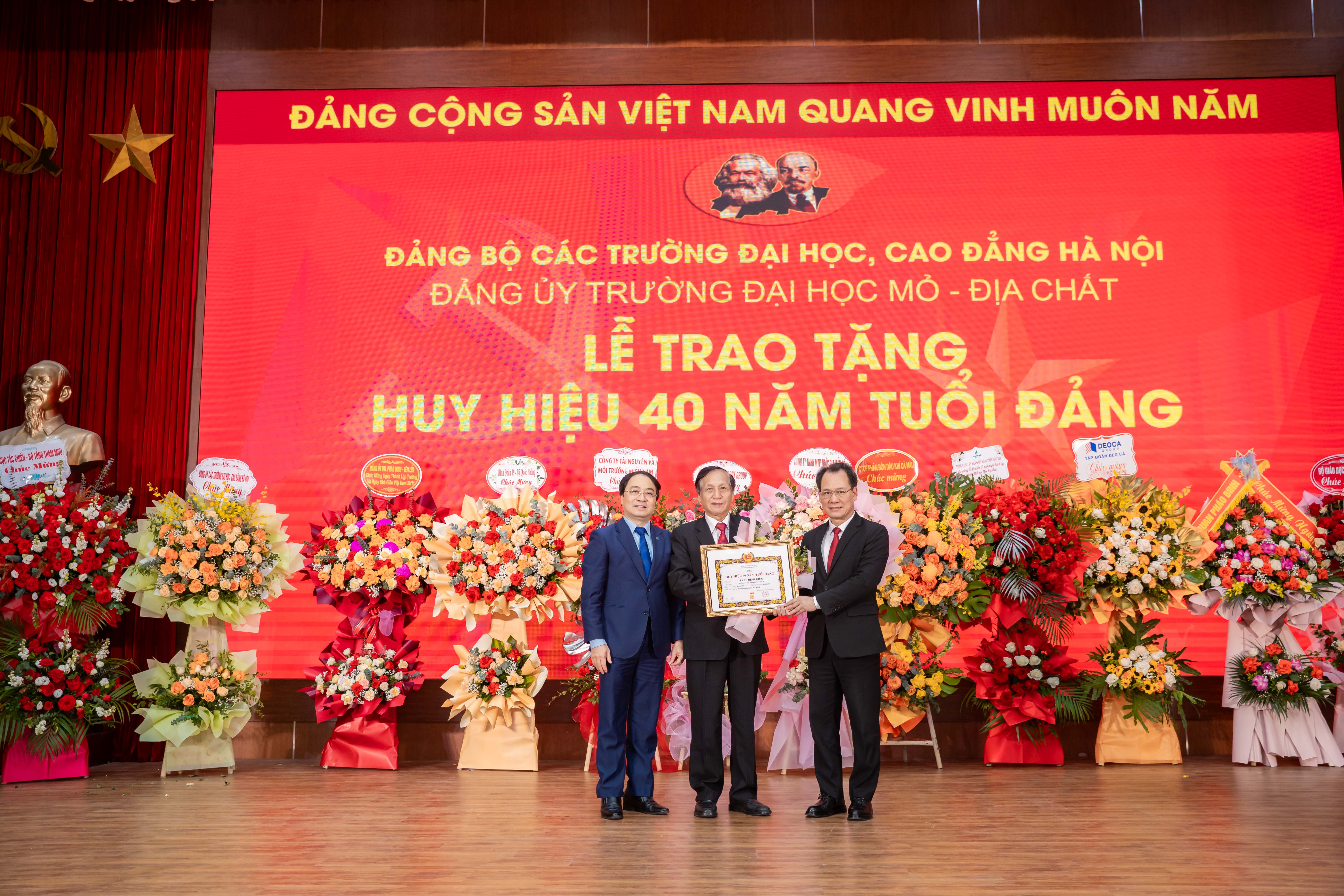 Tại buổi lễ, Đảng ủy Khối các trường Đại học, Cao đẳng Hà Nội và Đảng bộ Trường đã tổ chức trao Huy hiệu 40 năm và 30 năm tuổi Đảng cho các đảng viên thuộc Đảng bộ HUMG. Đây là sự ghi nhận trang trọng đối với quá trình phấn đấu, cống hiến bền bỉ của các đảng viên đối với Đảng, đối với sự nghiệp giáo dục và sự phát triển của Nhà trường. Ông Trần Thanh Sơn – Bí thư Đảng ủy Khối – đã trao Huy hiệu 40 năm tuổi Đảng cho PGS.TS Trần Đình Kiên – nguyên Bí thư Đảng ủy, nguyên Hiệu trưởng; và Huy hiệu 30 năm tuổi Đảng cho GS.TS Trần Thanh Hải – Hiệu trưởng và PGS.TS Đỗ Hữu Tùng – nguyên Chủ tịch Công đoàn, nguyên Trưởng khoa Kinh tế & Quản trị kinh doanh.