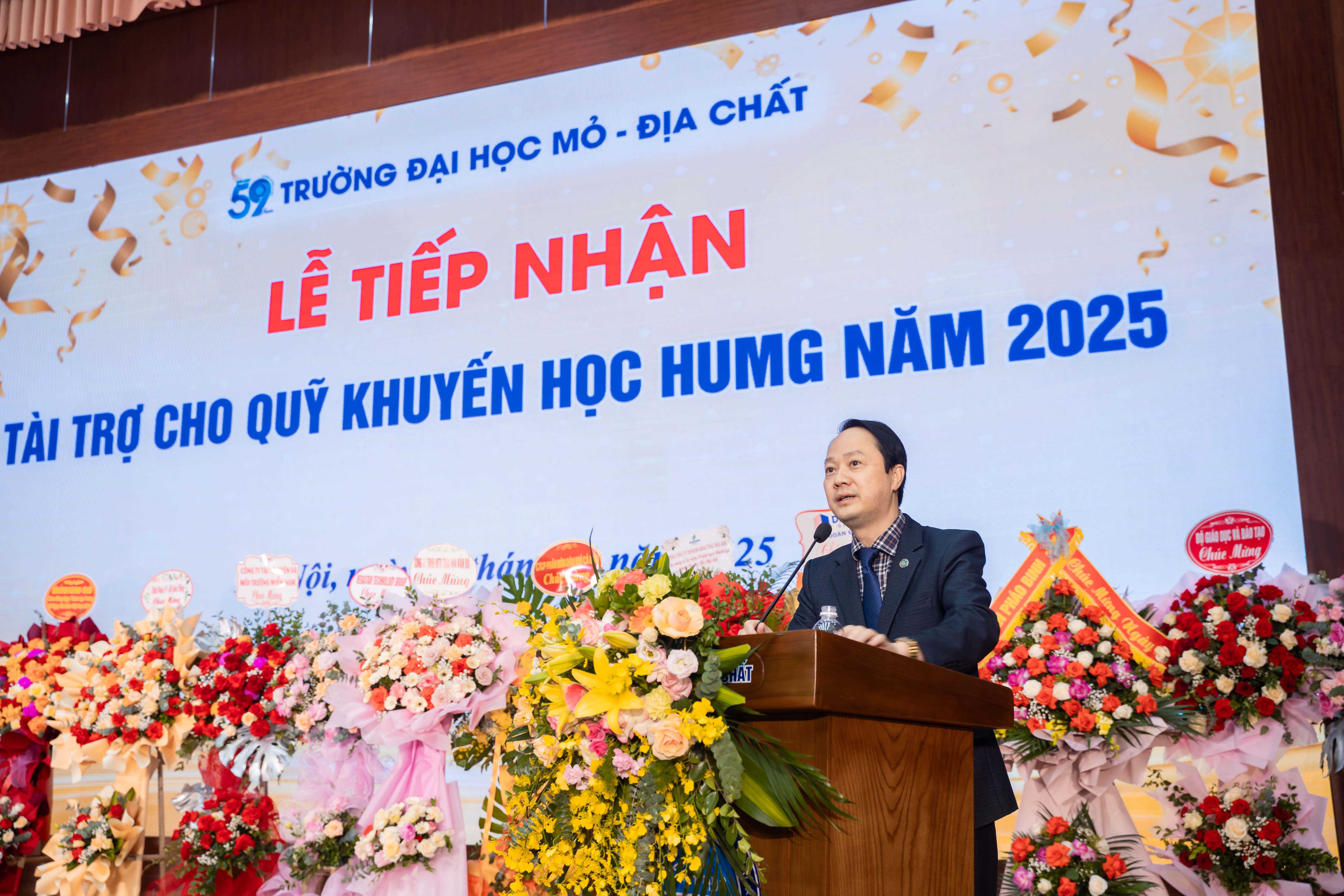 PGS.TS Triệu Hùng Trường, Phó Hiệu trưởng, Trưởng ban khuyến học HUMG phát biểu cảm ơn các đơn vị đã đồng hành, tài trợ cho Quỹ khuyến học HUMG