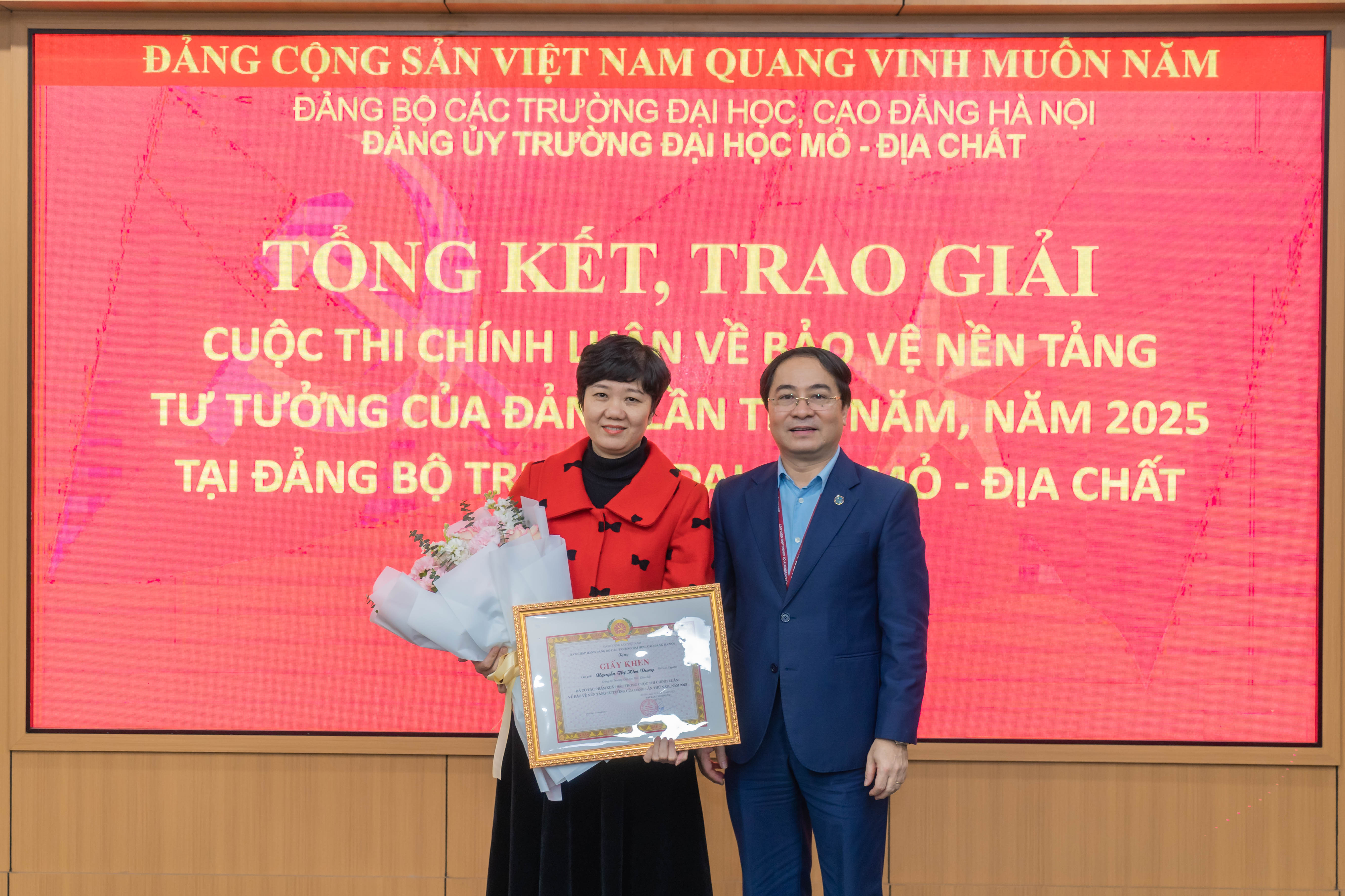 Với những kết quả nổi bật, Đảng ủy Trường Đại học Mỏ – Địa chất vinh dự được Đảng ủy các trường đại học, cao đẳng Hà Nội trao tặng Giấy khen vì có thành tích xuất sắc trong lãnh đạo, chỉ đạo Cuộc thi; cá nhân đồng chí Nguyễn Thị Kim Dung cũng được trao Giấy khen.