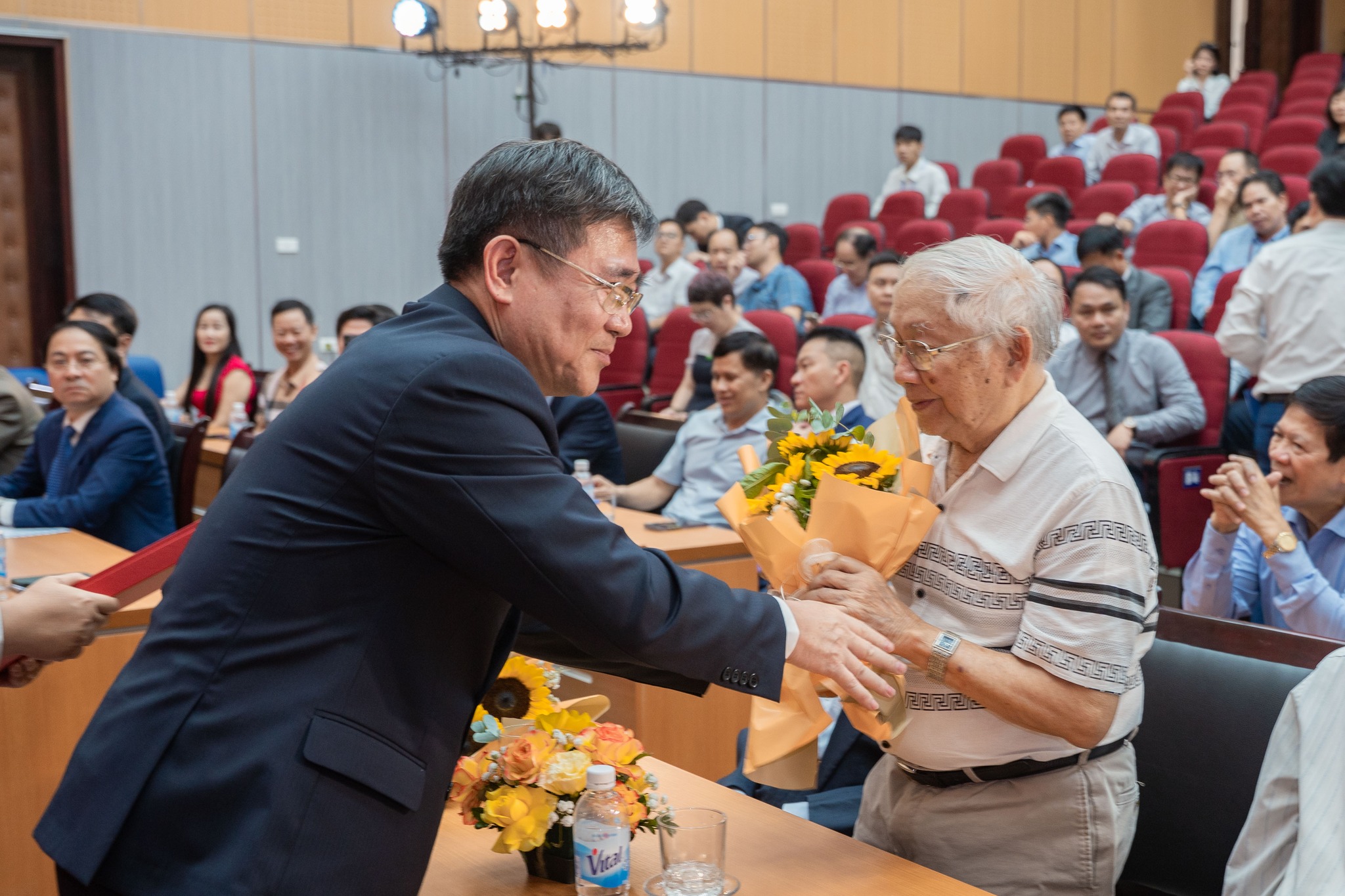 GS.TS Trần Thanh Hải - Hiệu trưởng, Trưởng Bộ môn Địa chất tặng hoa tri ân nguyên cán bộ Bộ môn GS.TSKH Phan Trường Thị