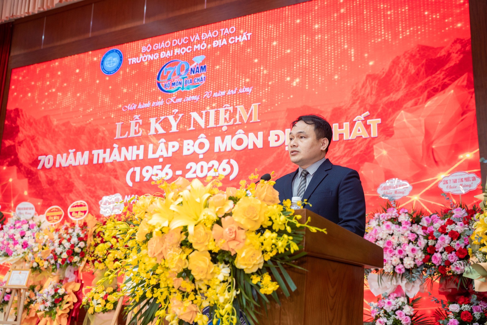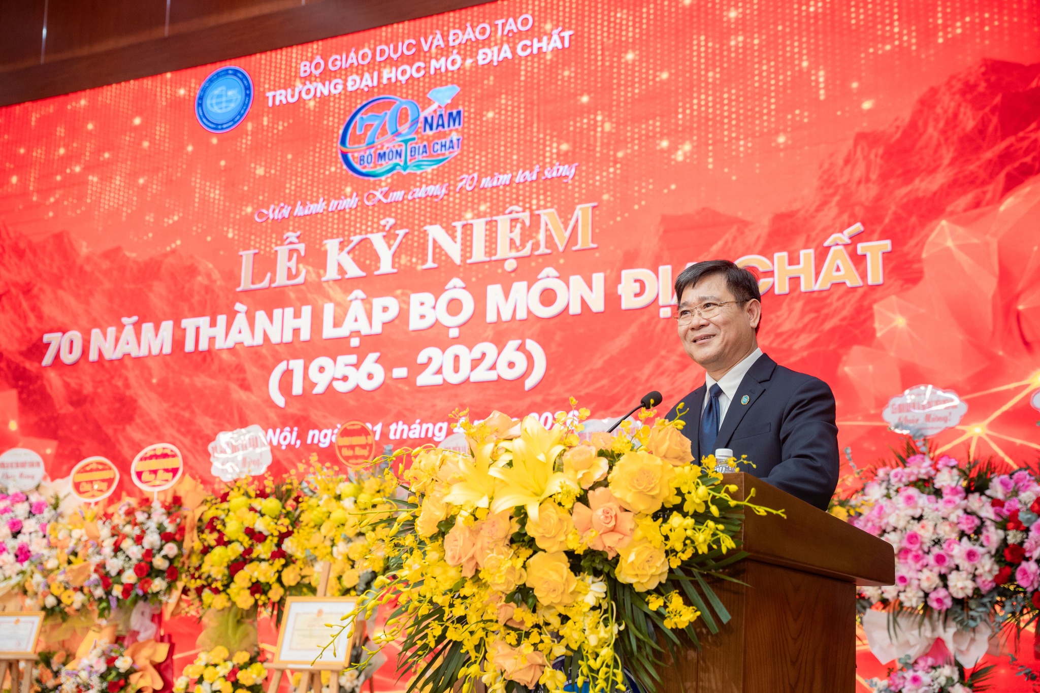 Tại buổi lễ, GS.TS Trần Thanh Hải – Hiệu trưởng, Trưởng Bộ môn Địa chất đã trình bày diễn văn Lễ kỷ niệm, tổng quát hành trình 70 năm với nhiều giai đoạn phát triển quan trọng: từ giai đoạn đặt nền móng trong điều kiện còn nhiều khó khăn, đến giai đoạn phát triển, mở rộng, khẳng định vị thế và hiện nay là giai đoạn phát triển theo chiều sâu gắn với hội nhập quốc tế. Bộ môn đạt nhiều thành tựu nổi bật tiêu biển như: chủ trì và tham gia nhiều đề tài trọng điểm cấp Quốc gia, Nghiên cứu cơ bản cấp Nhà nước, cấp Bộ; trong những nằm gần đây đã công bố gần 130 bài báo khoa học, trong đó có 40 bài thuộc danh mục WoS/Scopus; biên soạn 11 đầu sách, giáo trình. Bộ môn cũng đi đầu trong việc mở các ngành đào tạo mới, tiêu biểu là ngành Du lịch Địa chất (từ năm 2021), góp phần đáp ứng xu thế phát triển bền vững và nhu cầu xã hội; đồng thời đẩy mạnh hợp tác quốc tế với nhiều đối tác uy tín (Anh, Úc, Canada, Nhật Bản, Hàn Quốc…). Đặc biệt, các công trình nghiên cứu tiêu biểu đã được vinh danh bằng nhiều giải thưởng khoa học uy tín, như Giải thưởng Tạ Quang Bửu và Sách vàng Sáng tạo Việt Nam, qua đó góp phần khẳng định vị thế học thuật và uy tín của Bộ môn trong nước và quốc tế.