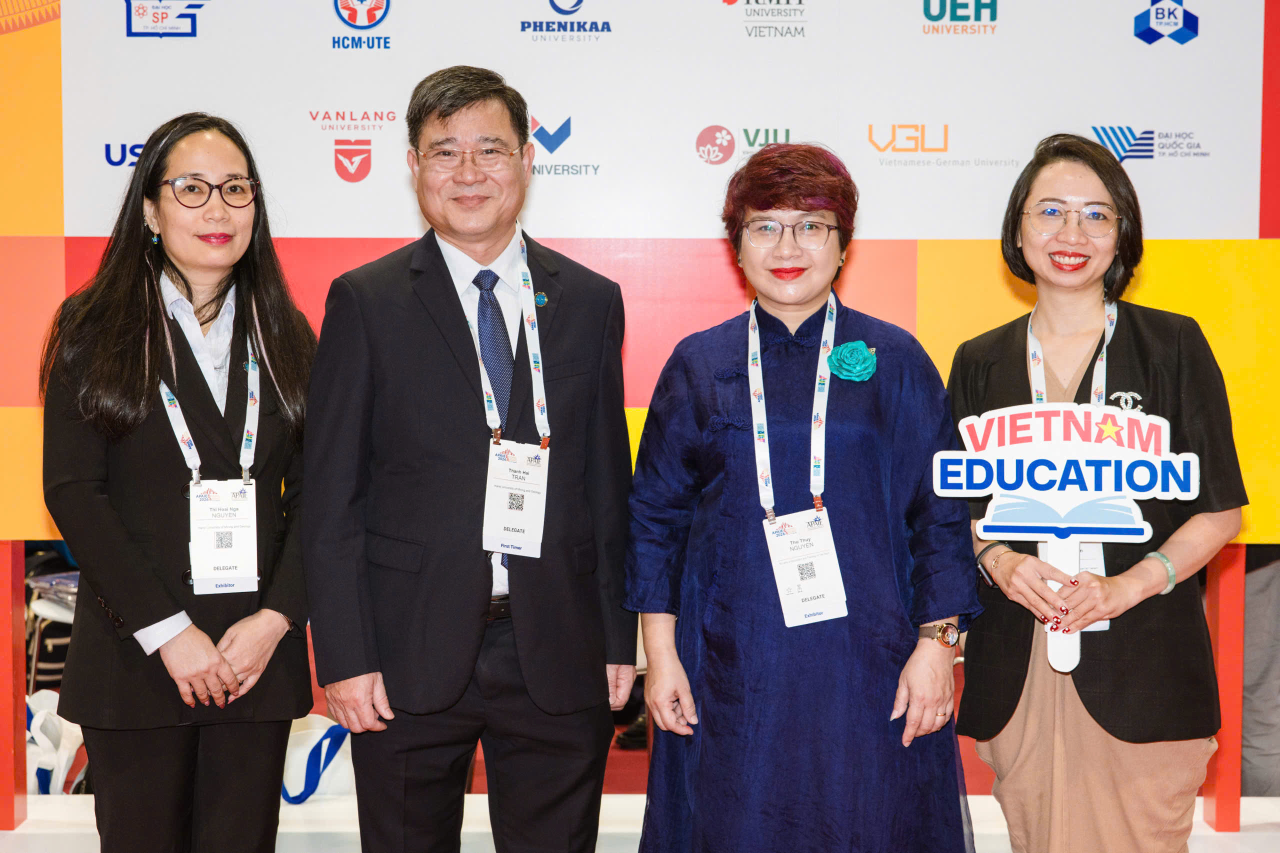 Đoàn công tác của HUMG tại APAIE 2026 chụp ảnh lưu niệm cùng Lãnh đạo Cục Hợp tác Quốc tế Bộ Giáo dục & Đào tạo Việt Nam - PGS.TS Nguyễn Thu Thủy (người đứng thứ hai từ bên phải qua)