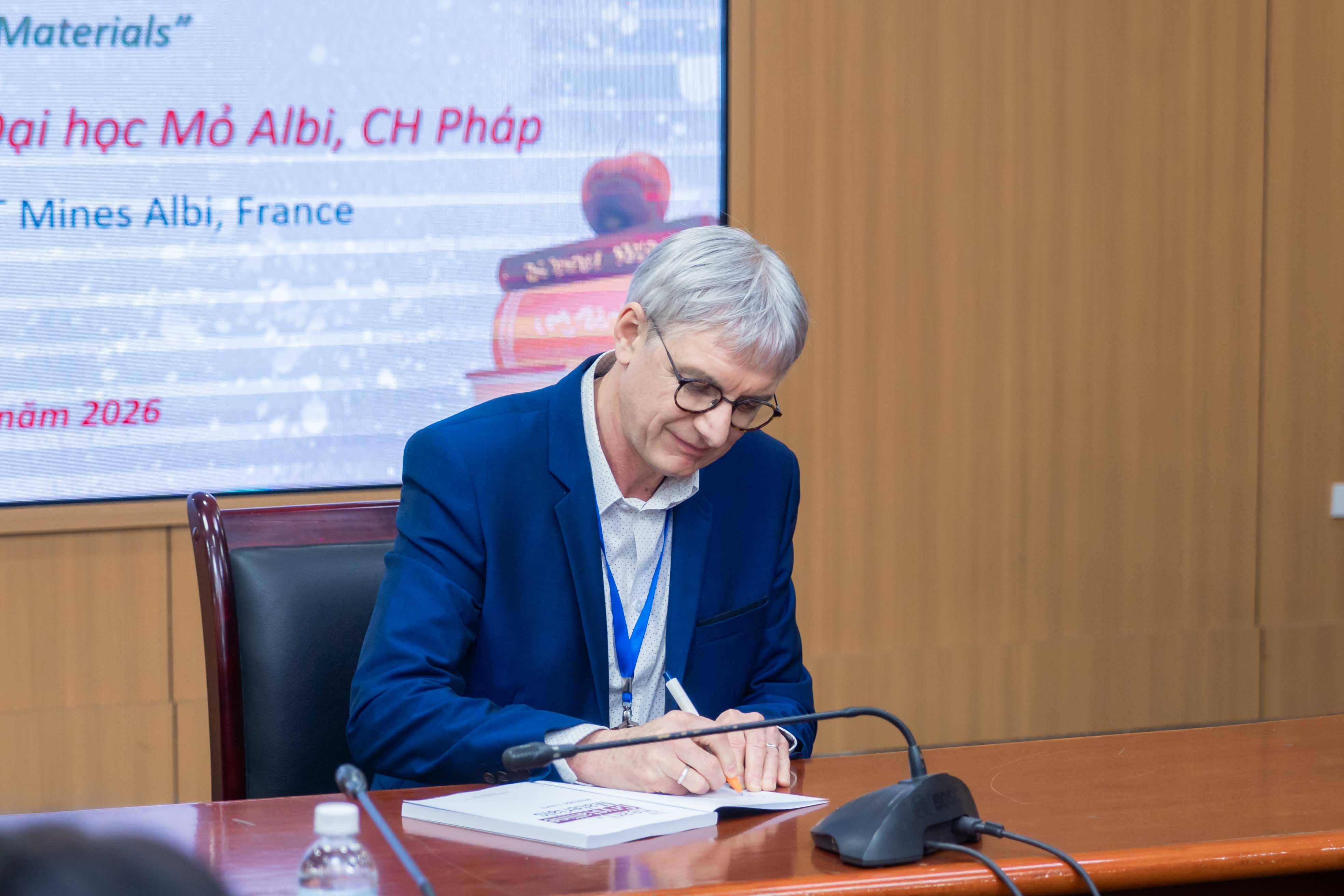 Phát biểu tại buổi lễ, Giáo sư Philippe Lours bày tỏ vinh dự được đến thăm HUMG, cảm ơn Nhà trường đã tạo điều kiện thuận lợi để ông giảng dạy cho Chương trình tiên tiến ngành Kỹ thuật hóa học, trao tặng sách và thảo luận kế hoạch hợp tác giữa hai trường trong thời gian sắp tới. Ông cho biết cuốn “The Heart of Crystalline Materials” là kết quả của nhiều năm giảng dạy và nghiên cứu trong lĩnh vực vật liệu tinh thể, được biên soạn nhằm hệ thống hóa các kiến thức nền tảng phục vụ người học trong các ngành kỹ thuật. Tác phẩm được xuất bản tại Malaysia và đang được sử dụng trong một số chương trình đào tạo chuyên môn. Giáo sư cũng chia sẻ rằng nhiều nội dung lý thuyết trong cuốn sách đã được ông áp dụng trong các buổi giảng dạy và trao đổi học thuật tại HUMG trong tuần này. Ông kỳ vọng ấn phẩm sẽ tiếp tục hỗ trợ người học tiếp cận lĩnh vực khoa học vật liệu một cách bài bản và hiệu quả hơn.
